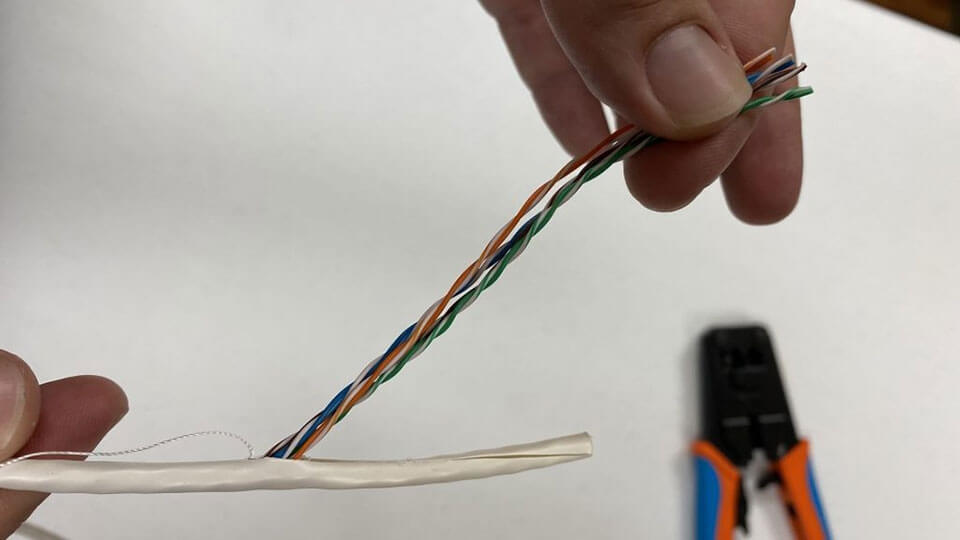 Lưu ý: Thao tác nhẹ nhàng, chỉ cắt lớp vỏ ngoài, tránh làm xước hoặc đứt 8 sợi dây lõi bên trong. Một sợi bị hỏng cũng có thể khiến kết nối thất bại.