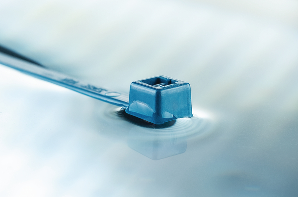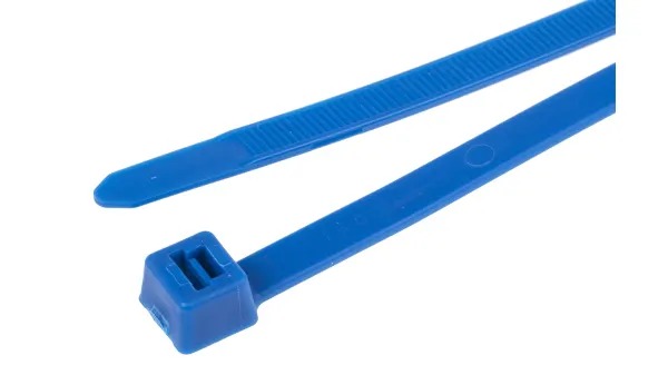Dây buộc cáp màu xanh lam được cung cấp cho ngành công nghiệp thực phẩm và chứa chất phụ gia kim loại để chúng có thể được phát hiện bằng máy dò kim loại công nghiệp.