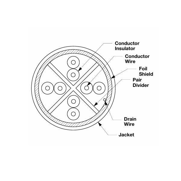 - Cả bốn cặp đều được bao quanh bởi một lá chắn kim loại tổng thể bên trong lớp vỏ chống cháy HDPE.